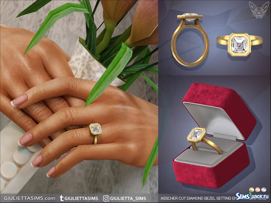 Оригинальное название - Asscher Cut Diamond Bezel Setting Engagement Ring. Обручальное кольцо с бриллиантом огранки " ашер " в оправе из белого золота. В комплекте 3 образца. Для женщин.
