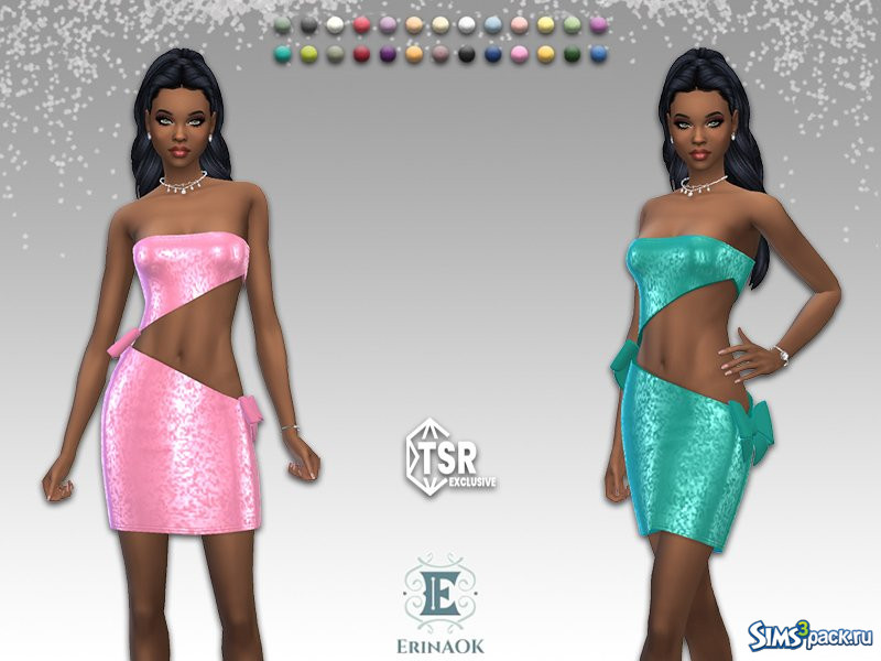 Женское металлизированное платье без бретелек с вырезом и шёлковыми бантами.