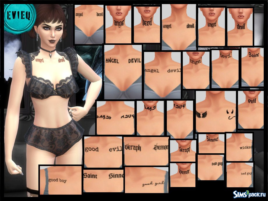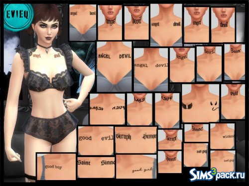 Татуировки на верхней части груди из игры Get to Work с 29 вариантами. Включает изображения ангела, дьявола, святого, грешника, серафима, демона, злодея, праведника, злодея, плохой девочки и хорошего мальчика.